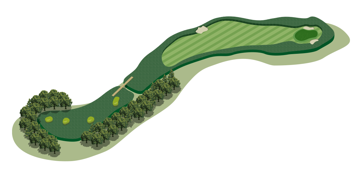 かるく右にドッグレッグしている14番のパー4。葦の密生した湿原を縫うようにレイアウトされている。正面のバンカーを狙って、ティーショットは正確に落としたい。とくに風向きには十分注意が必要。フェアウェイは比較的フラット。セカンドの距離感が難しい。とにかく第1打が最も大事な14番。