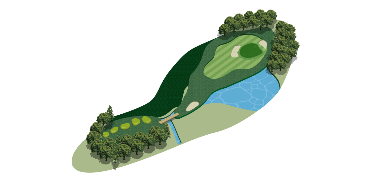 難関の4番を終えると、美しい5番パー3。気持ちよくティーショットが打てるホールです。左サイドと奥にあるバンカーがプレッシャーをかけていますが、気にせずグリーンセンター狙い。グリーン右側の池は、見た目より近いので、ピンが右に切ってある日は細心の注意が必要。