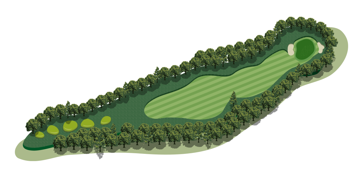 広いフェアウェイへ伸び伸びと打っていける。ただし、右サイドの大木を狙ったほうがセカンドがバンカー越えにならずに済む。セカンドは、やや打ち降ろし。グリーン手前から転がしてでもオン可能。グリーン奥のバンカーに捕まると難しいので手前から攻めるのがベスト。