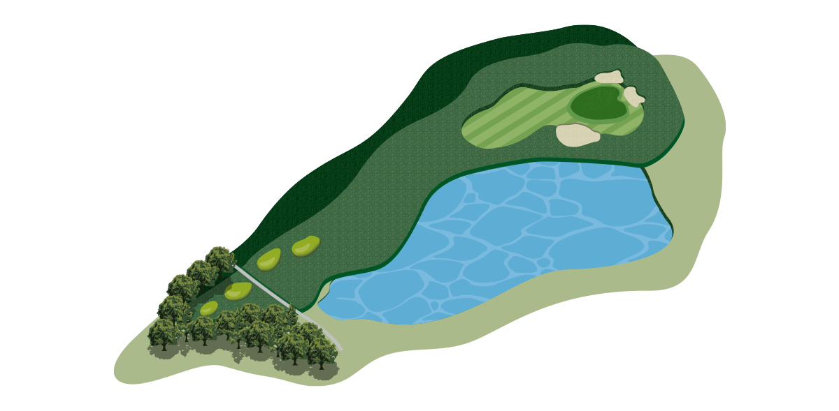 大きな池がティーからグリーンまで、右サイドに張りついている。このホールは、しばしばアゲインストの風が吹くので、クラブの選択は慎重に。フルショットするより、ワンクラブ大きめのクラブで手前に落として、転がして乗せる方が得策。右手前のバンカーだけは絶対避けて通りたい。