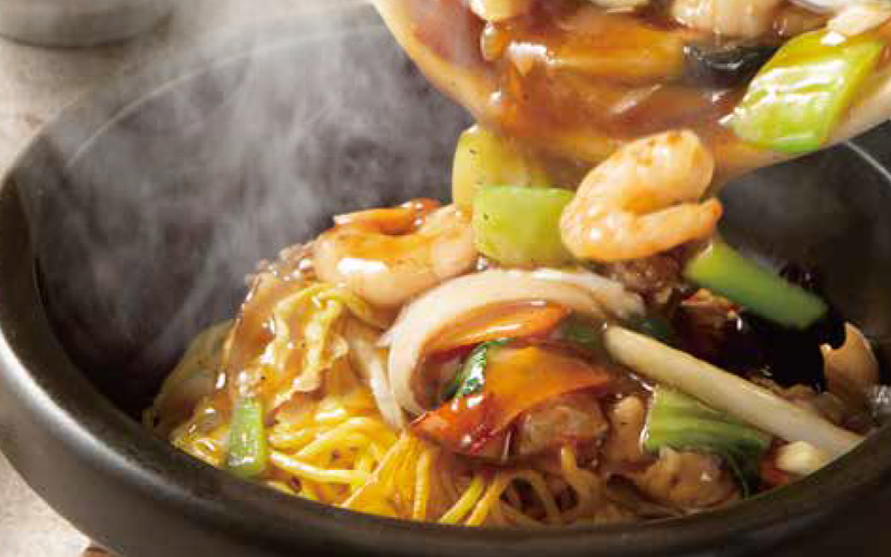 海老・ホタテをはじめ、具だくさんのあんを香ばしく焼いた麺にかけています。石焼鍋であつあつを楽しめる迫力のあるメニューです。